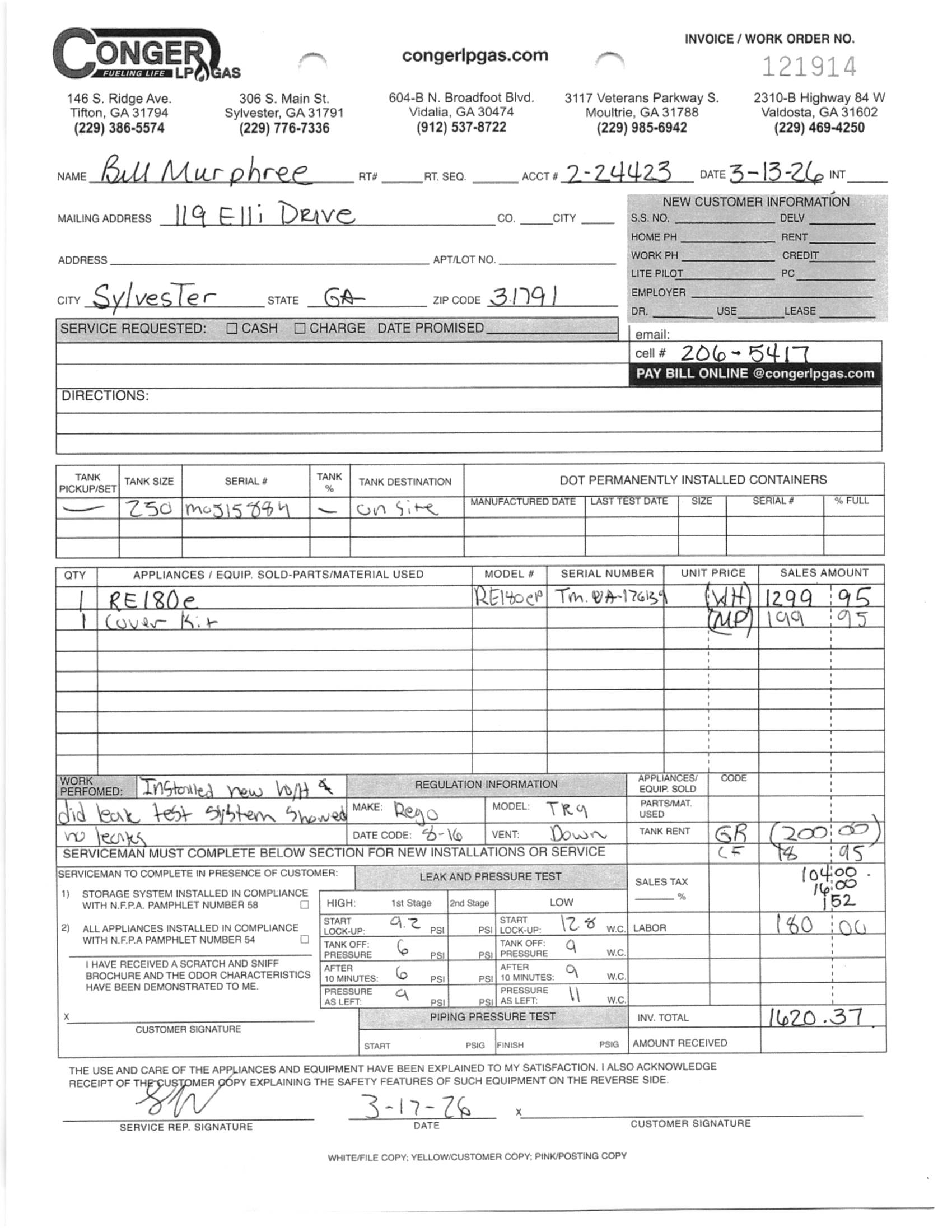 | 2025-36460143 | 03/20/2026 | Conger LP gas Moultrie | Kyle Johnson | (229) 985-6942 | Email hidden; Javascript is required. | Payment Sent | 02/23/2026 | 02/23/2026 | Jordan Ledford | Replacement or New Appliance | $200.00 | 1 | New Installation | Propane-Fueled Non-Recirculating Water Heater ($200.00) | Rinnai | RL75ep | FC.CA-042062 | 02/23/2026 | 3724_260320094303_001.pdf | $200.00 | Conger LP Gas Moultrie | Kyle Johnson | 3117 veterans parkway s Moultrie, Georgia 31768 Map It | Email hidden; Javascript is required. | (229) 985-6942 | Mike Burdick | (928) 242-4602 | Email hidden; Javascript is required. | 248 Suwanee Rd Moultrie, Georgia 31788 Map It | 248 Suwanee Rd Moultrie, Georgia 31788 Map It | 3724_260320094303_0011.pdf | |||||||||||||||||