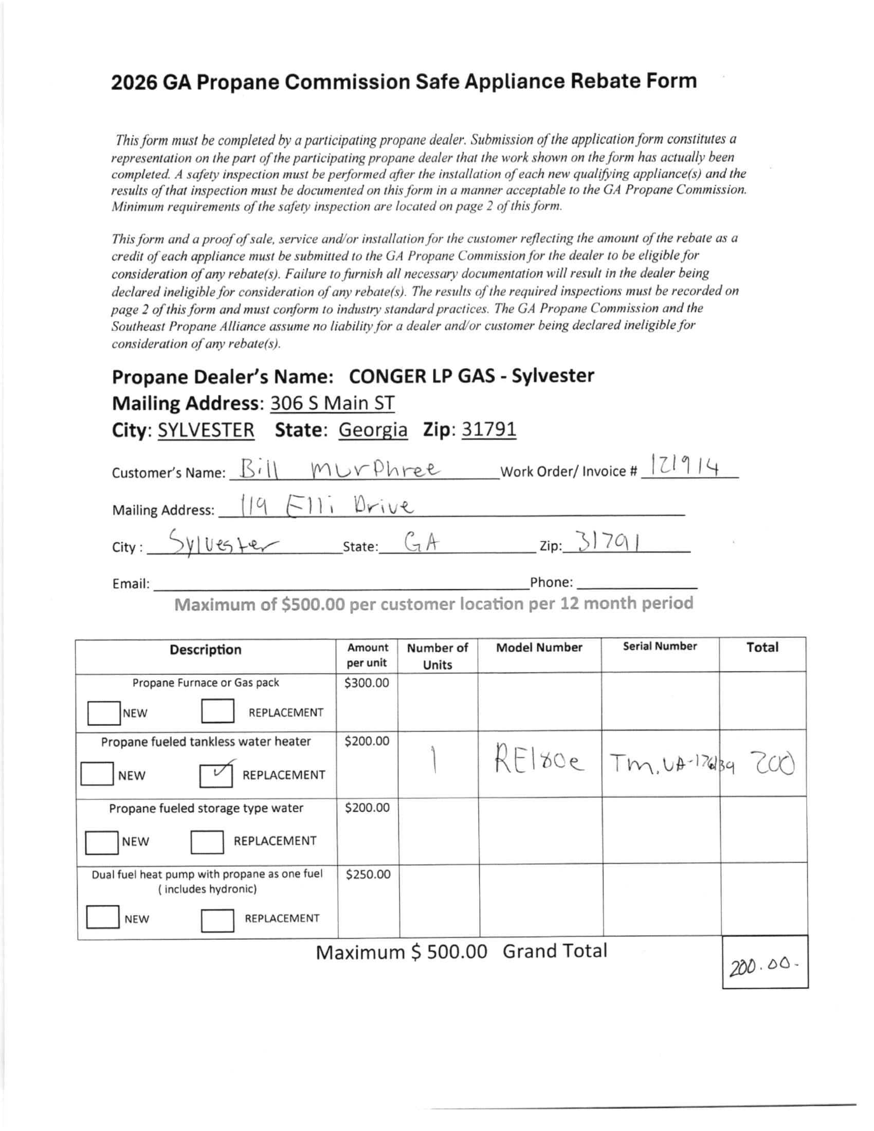 | 2025-11118983 | 03/19/2026 | Conger LP | Debora Simning | (229) 776-7336 | Email hidden; Javascript is required. | Payment Sent | 03/17/2026 | 03/17/2026 | Levi Wilbanks | Replacement or New Appliance | $200.00 | 1 | Replacement Installation | Propane-Fueled Non-Recirculating Water Heater ($200.00) | Rinna | RE180e | TM.UA-176139 | 03/17/2026 | ![]() | $200.00 | Conger LP | Debora Simning | 306 S Main St Sylvester, Georgia 31791 Map It | Email hidden; Javascript is required. | (229) 776-7336 | Bill Murphree | (229) 881-9477 | 119 ELLI DR SYLVESTER, Georgia 31791 Map It | 119 ELLI DR SYLVESTER, Georgia 31791 Map It | |||||||||||||||||||