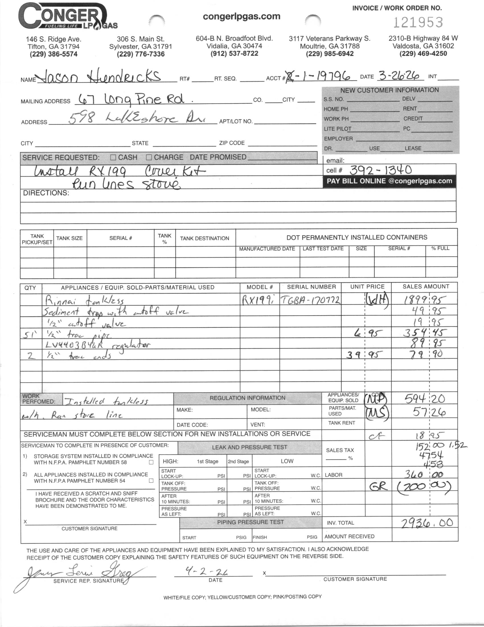 | 2025-86818198 | 04/03/2026 | Conger LP gas Moultrie | Kyle Johnson | (229) 985-6942 | Email hidden; Javascript is required. | Payment Sent | 03/27/2026 | 03/27/2026 | Jordan Ledford | Replacement or New Appliance | $200.00 | 1 | Replacement Installation | Propane-Fueled Non-Recirculating Water Heater ($200.00) | Rinnai | RE199ep | TG.UA-112052 | 03/27/2026 | 3825_260403093449_001.pdf | $200.00 | Conger LP Gas Moultrie | Kyle Johnson | 3117 veterans parkway s Moultrie, Georgia 31768 Map It | Email hidden; Javascript is required. | (229) 985-6942 | Elica Alverado | (229) 589-1903 | Email hidden; Javascript is required. | 211 Circle Rd Moultrie, Georgia 31768 Map It | 204 Circle rd Moultrie, Georgia 31768 Map It | 3825_260403093449_0011.pdf | |||||||||||||||||