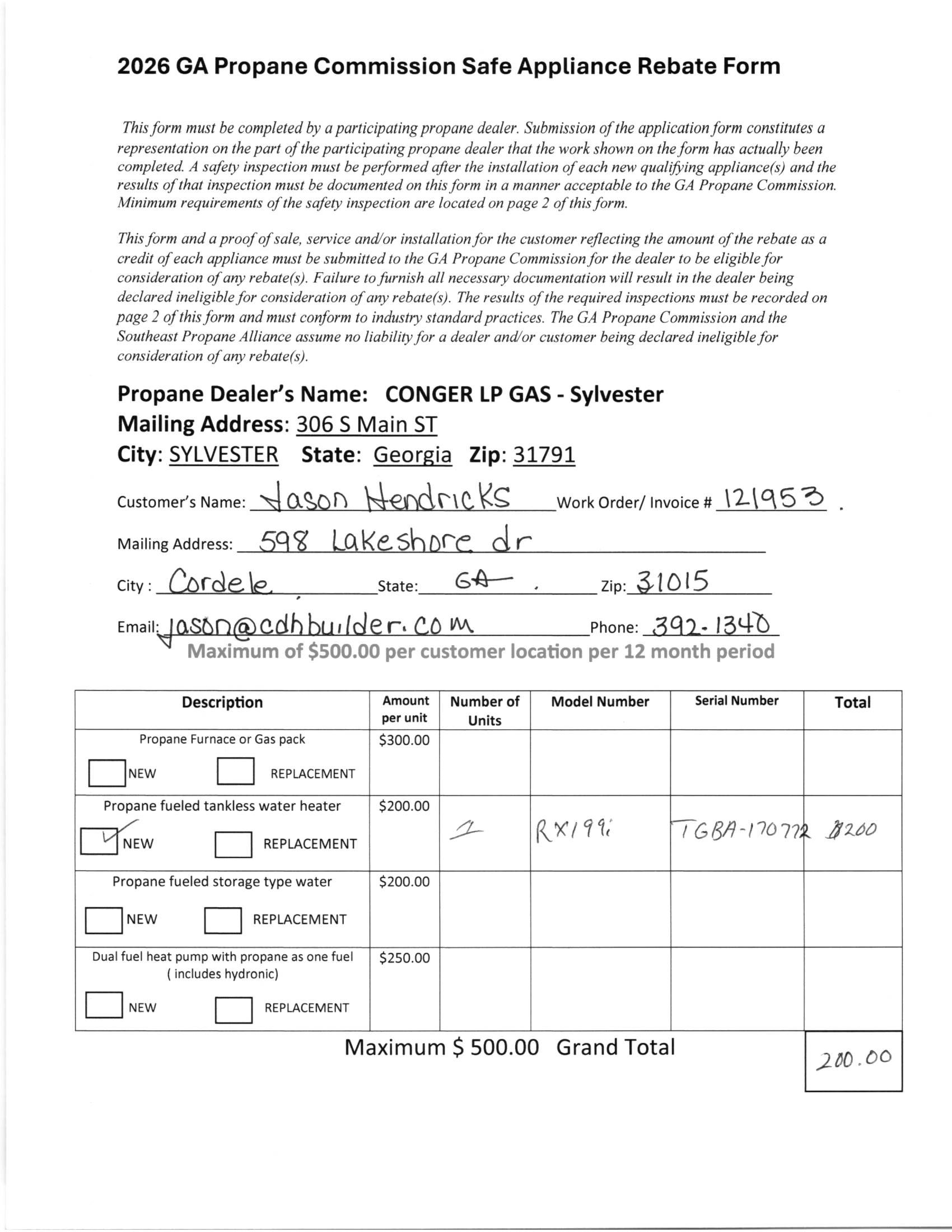 | 2025-80641979 | 04/06/2026 | Conger LP | Debora Simning | (229) 776-7336 | Email hidden; Javascript is required. | Payment Sent | 04/02/2026 | 04/02/2026 | James Seabolt | Replacement or New Appliance | $200.00 | 1 | New Installation | Propane-Fueled Non-Recirculating Water Heater ($200.00) | Rinnai | RX199i | TG.BA-170772 | 04/02/2026 | ![]() | $200.00 | Conger LP | Debora Simning | 306 S Main St Sylvester, Georgia 31791 Map It | Email hidden; Javascript is required. | (229) 776-7336 | Jason Hendricks | (229) 392-1340 | Email hidden; Javascript is required. | Jason Hendricks 598 Lakeshore Dr Cordele, Georgia 31015 Map It | Jason Hendricks 598 Lakeshore Dr Cordele, Georgia 31015 Map It | ||||||||||||||||||