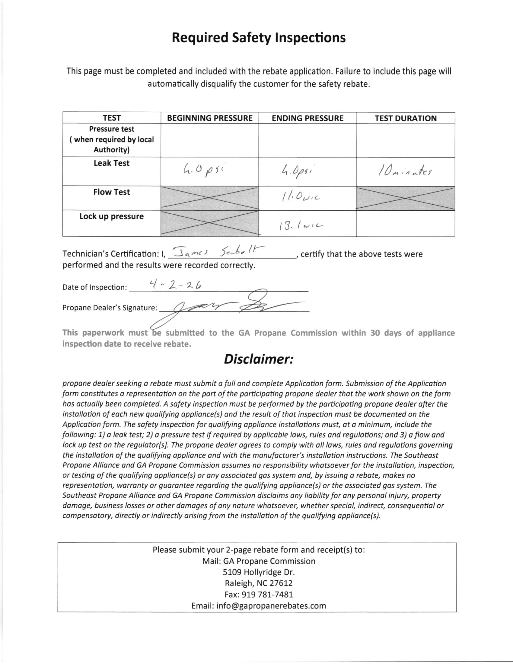 | Invoice # | Today's Date | Company Name | Company Contact | Company Phone | Company Email | Rebate Status | Safety Inspection Date | Purchase/Invoice Date | Safety Inspector’s Full Name | Type of Installation | Total | How many rebates would you like to claim? | Installation Type | Appliance Type | Brand | Model # | Model # | Serial Number | Installation Date | Upload Receipt | Appliance Type | Brand | Model # | Model # | Serial Number | Installation Date | Upload Receipt | Appliance Type | Brand | Model # | Model # | Serial Number | Installation Date | Upload Receipt | Total | Propane Company Name | Propane Marketer Name | Mailing Address | Email Address | Phone Number | Customer / Recipient Name | Customer / Recipient Phone Number | Customer / Recipient Email | Customer / Recipient Address | Customer / Recipient Installation Address | Upload Proof of Purchase: | Name of Builder/Contractor | Upload Spec Sheet for Manufactured Home |