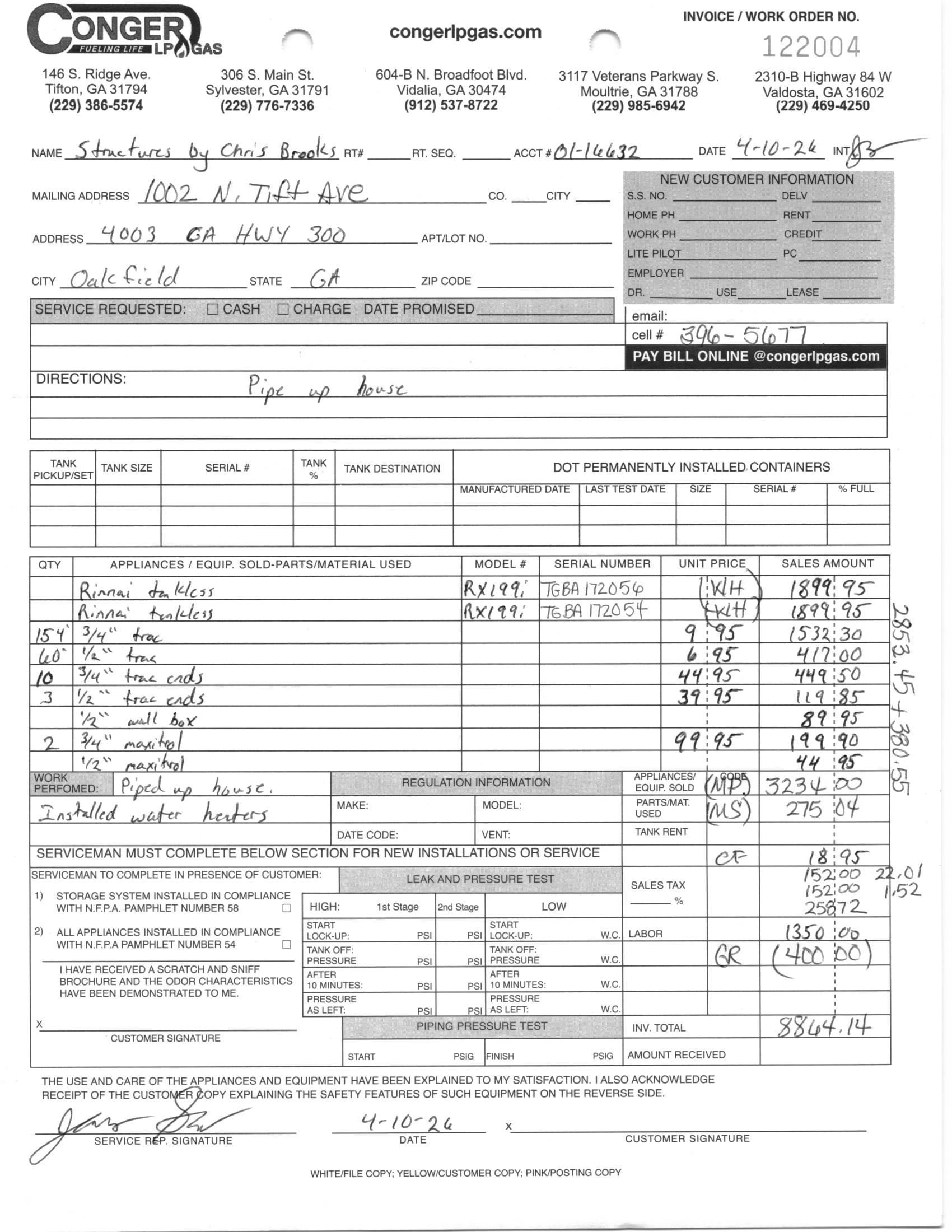 | 2025-88848249 | 04/20/2026 | Conger LP Gas | KAYLEA SMITH | (229) 469-4250 | Email hidden; Javascript is required. | Submitted | 04/10/2026 | 04/10/2026 | Cole Truett | Replacement or New Appliance | $200.00 | 1 | Replacement Installation | Propane-Fueled Non-Recirculating Water Heater ($200.00) | Rinnai | RE160eP | WC.UA-022378 | 04/10/2026 | GLOSTER-1555_0488_260420090021_001.pdf | $200.00 | Conger LP Gas | Richard McCranie | 2310 US Hwy 84 W Suite B Valdosta, Georgia 31601 Map It | Email hidden; Javascript is required. | (229) 469-4250 | Gloster Family LLC | (770) 820-6523 | Email hidden; Javascript is required. | 3355 Bethany Bend Alpharetta, Georgia 30004 Map It | 1555 Livingston Road Quitman, Georgia 31643 Map It | GLOSTER-1555_0488_260420090021_0011.pdf | |||||||||||||||||